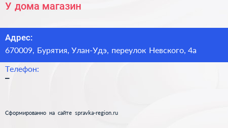 У дома, магазин по адресу 670009, Бурятия, Улан-Удэ, переулок Невского, 4а в дальнейшем Организация, размещена в следующих категориях: