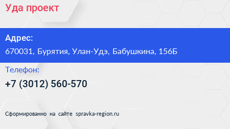 Уда проект по адресу 670031, Бурятия, Улан-Удэ, Бабушкина, 156Б в дальнейшем Организация, размещена в следующих категориях: