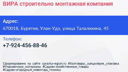 ВИРА, строительно-монтажная компания по адресу 670018, Бурятия, Улан-Удэ, улица Талалихина, 45 в дальнейшем Организация, размещена в следующих категориях: