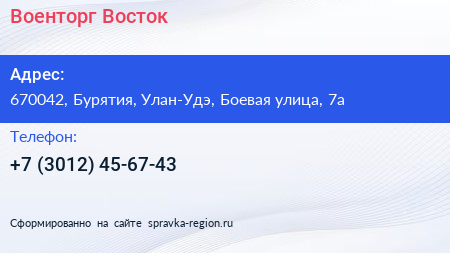 Военторг-Восток по адресу 670042, Бурятия, Улан-Удэ, Боевая улица, 7а в дальнейшем Организация, размещена в следующих категориях: