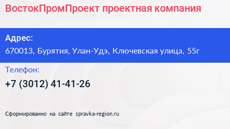 ВостокПромПроект, проектная компания по адресу 670013, Бурятия, Улан-Удэ, Ключевская улица, 55г в дальнейшем Организация, размещена в следующих категориях:
