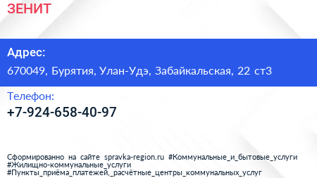 ЗЕНИТ по адресу 670049, Бурятия, Улан-Удэ, Забайкальская, 22 ст3 в дальнейшем Организация, размещена в следующих категориях: