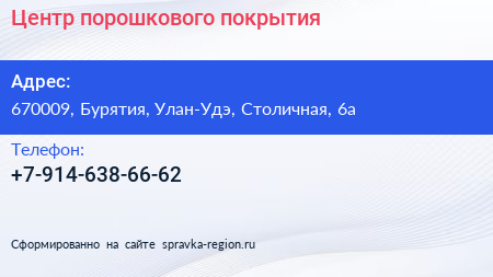Центр порошкового покрытия по адресу 670009, Бурятия, Улан-Удэ, Столичная, 6а в дальнейшем Организация, размещена в следующих категориях: