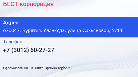 БЕСТ, корпорация по адресу 670047, Бурятия, Улан-Удэ, улица Сахьяновой, 9/14 в дальнейшем Организация, размещена в следующих категориях: