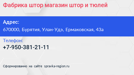 Фабрика штор, магазин штор и тюлей по адресу 670000, Бурятия, Улан-Удэ, Ермаковская, 43а в дальнейшем Организация, размещена в следующих категориях: