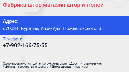 Фабрика штор, магазин штор и тюлей по адресу 670034, Бурятия, Улан-Удэ, Пржевальского, 3 в дальнейшем Организация, размещена в следующих категориях: