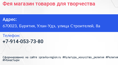 Фея, магазин товаров для творчества по адресу 670023, Бурятия, Улан-Удэ, улица Строителей, 8а в дальнейшем Организация, размещена в следующих категориях: