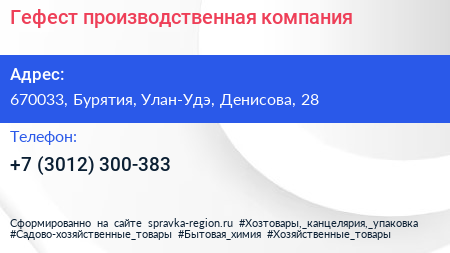 Гефест, производственная компания по адресу 670033, Бурятия, Улан-Удэ, Денисова, 28 в дальнейшем Организация, размещена в следующих категориях: