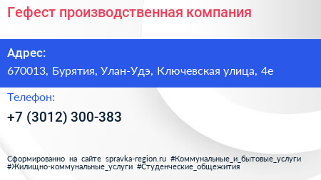 Гефест, производственная компания по адресу 670013, Бурятия, Улан-Удэ, Ключевская улица, 4е в дальнейшем Организация, размещена в следующих категориях: