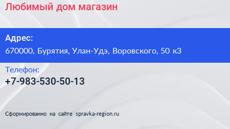 Любимый дом, магазин по адресу 670000, Бурятия, Улан-Удэ, Воровского, 50 к3 в дальнейшем Организация, размещена в следующих категориях: