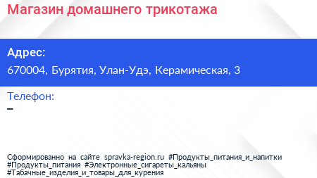Магазин домашнего трикотажа по адресу 670004, Бурятия, Улан-Удэ, Керамическая, 3 в дальнейшем Организация, размещена в следующих категориях: