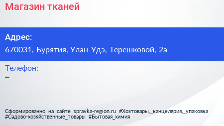 Магазин тканей по адресу 670031, Бурятия, Улан-Удэ, Терешковой, 2а в дальнейшем Организация, размещена в следующих категориях: