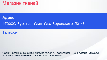 Магазин тканей по адресу 670000, Бурятия, Улан-Удэ, Воровского, 50 к3 в дальнейшем Организация, размещена в следующих категориях: