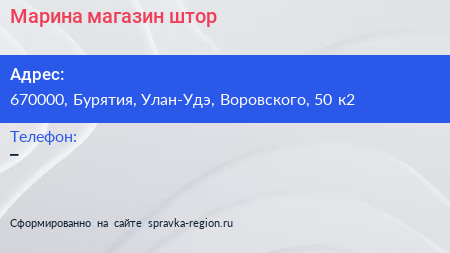 Марина, магазин штор по адресу 670000, Бурятия, Улан-Удэ, Воровского, 50 к2 в дальнейшем Организация, размещена в следующих категориях: