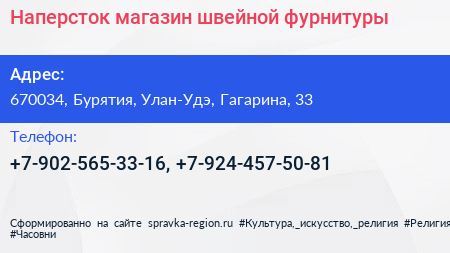 Наперсток, магазин швейной фурнитуры по адресу 670034, Бурятия, Улан-Удэ, Гагарина, 33 в дальнейшем Организация, размещена в следующих категориях: