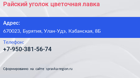 Райский уголок, цветочная лавка по адресу 670023, Бурятия, Улан-Удэ, Кабанская, 8Б в дальнейшем Организация, размещена в следующих категориях: