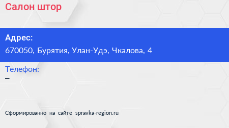 Салон штор по адресу 670050, Бурятия, Улан-Удэ, Чкалова, 4 в дальнейшем Организация, размещена в следующих категориях: