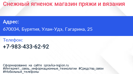 Снежный ягненок, магазин пряжи и вязания по адресу 670034, Бурятия, Улан-Удэ, Гагарина, 25 в дальнейшем Организация, размещена в следующих категориях: