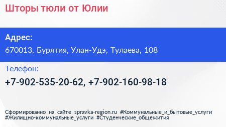 Шторы-тюли от Юлии по адресу 670013, Бурятия, Улан-Удэ, Тулаева, 108 в дальнейшем Организация, размещена в следующих категориях:
