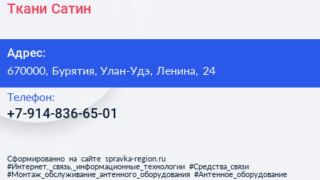 Ткани Сатин по адресу 670000, Бурятия, Улан-Удэ, Ленина, 24 в дальнейшем Организация, размещена в следующих категориях: