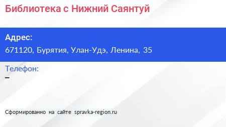 Библиотека, с. Нижний Саянтуй по адресу 671120, Бурятия, Улан-Удэ, Ленина, 35 в дальнейшем Организация, размещена в следующих категориях: