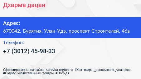 Дхарма, дацан по адресу 670042, Бурятия, Улан-Удэ, проспект Строителей, 46а в дальнейшем Организация, размещена в следующих категориях:
