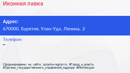 Иконная лавка по адресу 670000, Бурятия, Улан-Удэ, Ленина, 2 в дальнейшем Организация, размещена в следующих категориях: