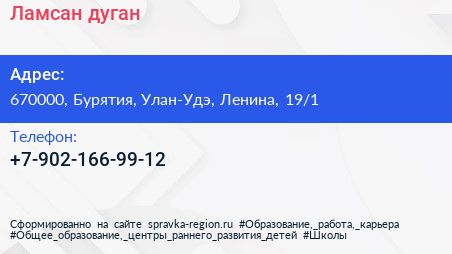 Ламсан, дуган по адресу 670000, Бурятия, Улан-Удэ, Ленина, 19/1 в дальнейшем Организация, размещена в следующих категориях: