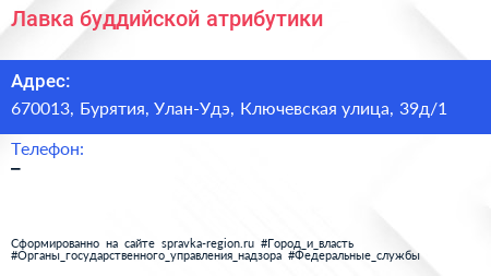 Лавка буддийской атрибутики по адресу 670013, Бурятия, Улан-Удэ, Ключевская улица, 39д/1 в дальнейшем Организация, размещена в следующих категориях: