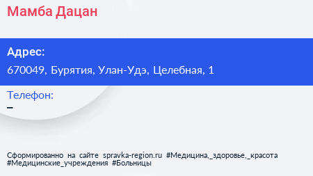 Мамба Дацан по адресу 670049, Бурятия, Улан-Удэ, Целебная, 1 в дальнейшем Организация, размещена в следующих категориях: