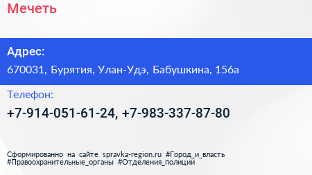 Мечеть по адресу 670031, Бурятия, Улан-Удэ, Бабушкина, 156а в дальнейшем Организация, размещена в следующих категориях: