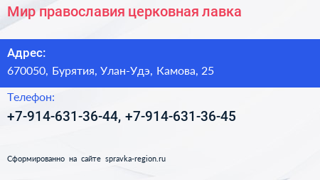 Мир православия, церковная лавка по адресу 670050, Бурятия, Улан-Удэ, Камова, 25 в дальнейшем Организация, размещена в следующих категориях:
