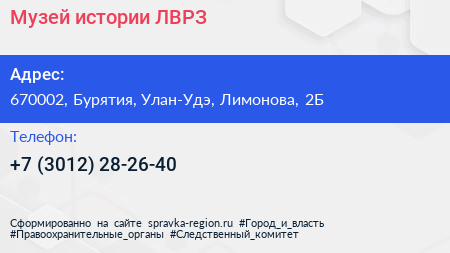 Музей истории ЛВРЗ по адресу 670002, Бурятия, Улан-Удэ, Лимонова, 2Б в дальнейшем Организация, размещена в следующих категориях: