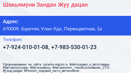 Шакьямуни Зандан Жуу, дацан по адресу 670009, Бурятия, Улан-Удэ, Первоцветная, 1а в дальнейшем Организация, размещена в следующих категориях: