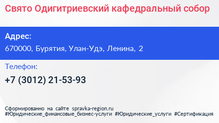 Свято-Одигитриевский кафедральный собор по адресу 670000, Бурятия, Улан-Удэ, Ленина, 2 в дальнейшем Организация, размещена в следующих категориях: