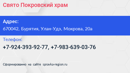 Свято-Покровский храм по адресу 670042, Бурятия, Улан-Удэ, Мокрова, 20а в дальнейшем Организация, размещена в следующих категориях: