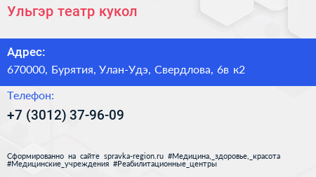 Ульгэр, театр кукол по адресу 670000, Бурятия, Улан-Удэ, Свердлова, 6в к2 в дальнейшем Организация, размещена в следующих категориях: