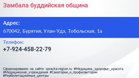 Замбала, буддийская община по адресу 670042, Бурятия, Улан-Удэ, Тобольская, 1а в дальнейшем Организация, размещена в следующих категориях: