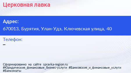 Церковная лавка по адресу 670013, Бурятия, Улан-Удэ, Ключевская улица, 40 в дальнейшем Организация, размещена в следующих категориях: