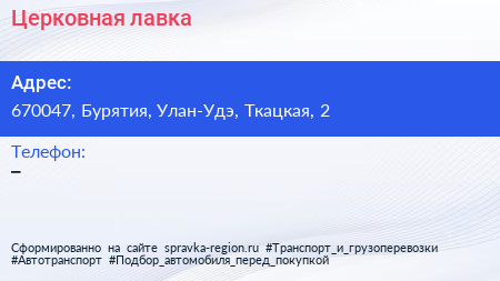 Церковная лавка по адресу 670047, Бурятия, Улан-Удэ, Ткацкая, 2 в дальнейшем Организация, размещена в следующих категориях: