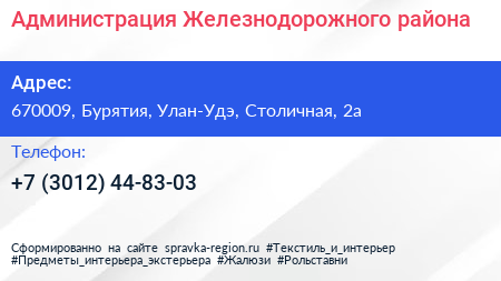 Администрация Железнодорожного района по адресу 670009, Бурятия, Улан-Удэ, Столичная, 2а в дальнейшем Организация, размещена в следующих категориях: