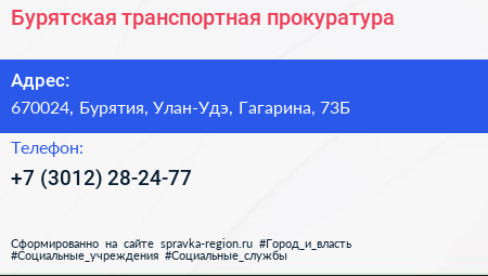 Бурятская транспортная прокуратура по адресу 670024, Бурятия, Улан-Удэ, Гагарина, 73Б в дальнейшем Организация, размещена в следующих категориях: