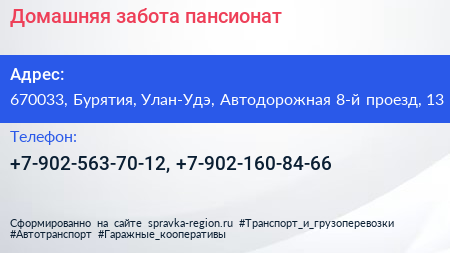 Домашняя забота, пансионат по адресу 670033, Бурятия, Улан-Удэ, Автодорожная 8-й проезд, 13 в дальнейшем Организация, размещена в следующих категориях:
