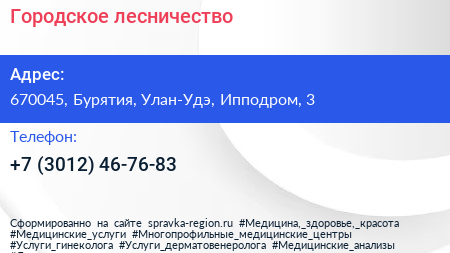 Городское лесничество по адресу 670045, Бурятия, Улан-Удэ, Ипподром, 3 в дальнейшем Организация, размещена в следующих категориях: