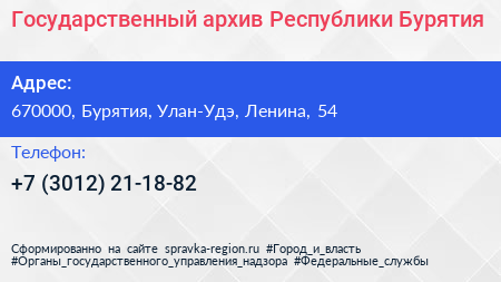 Государственный архив Республики Бурятия по адресу 670000, Бурятия, Улан-Удэ, Ленина, 54 в дальнейшем Организация, размещена в следующих категориях: