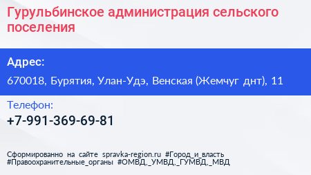 Гурульбинское, администрация сельского поселения по адресу 670018, Бурятия, Улан-Удэ, Венская (Жемчуг днт), 11 в дальнейшем Организация, размещена в следующих категориях: