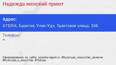 Надежда, женский приют по адресу 671056, Бурятия, Улан-Удэ, Трактовая улица, 26Б в дальнейшем Организация, размещена в следующих категориях: