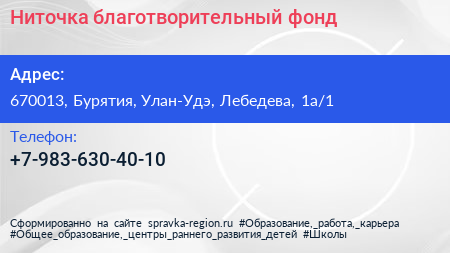 Ниточка, благотворительный фонд по адресу 670013, Бурятия, Улан-Удэ, Лебедева, 1а/1 в дальнейшем Организация, размещена в следующих категориях: