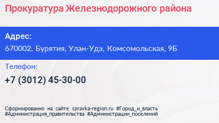 Прокуратура Железнодорожного района по адресу 670002, Бурятия, Улан-Удэ, Комсомольская, 9Б в дальнейшем Организация, размещена в следующих категориях: