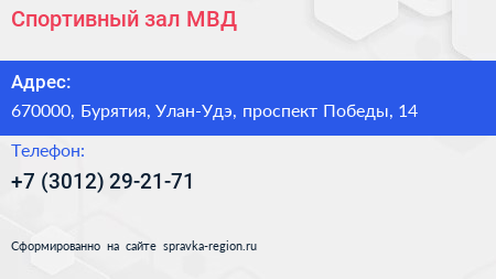 Спортивный зал МВД по адресу 670000, Бурятия, Улан-Удэ, проспект Победы, 14 в дальнейшем Организация, размещена в следующих категориях: